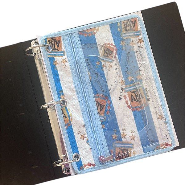 Realizada en cordura y cristal. Lleva un cierre reforzado y 3 arandelas para pasar por los anillos de la carpeta.