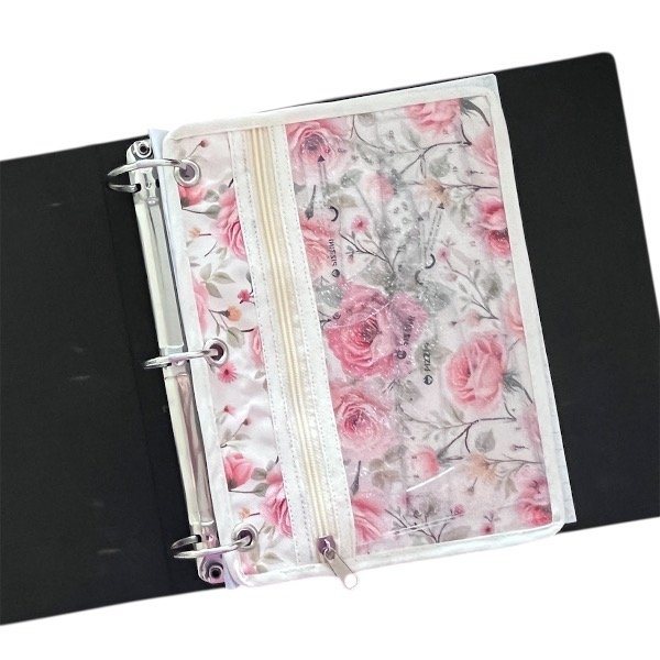 Realizada en cordura y cristal. Lleva un cierre reforzado y 3 arandelas para pasar por los anillos de la carpeta.
