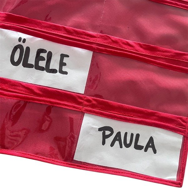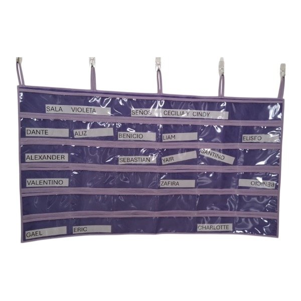 Contiene 30 compartimentos para poner los nombres de los niños y un compartimento superior sin divisiones para poner nombre de la sala o lo que se desee.